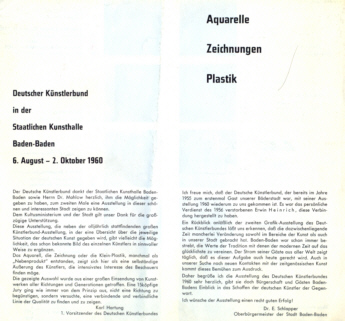Deutscher Künstlerbund in der Staatlichen Kunsthalle Baden-Baden 06. August bis 02. Oktober 1960